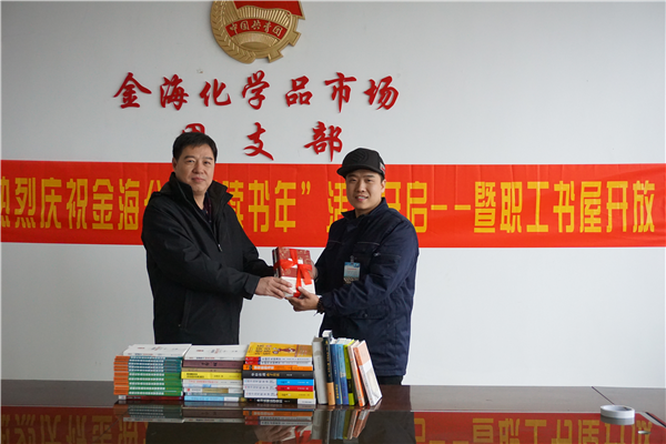 1月19日上午,金海化學品市場舉行“讀書年活動開啟暨職工書屋開放”儀式,冶煉公司總工程師王運健、工會副主席肖云雷為職工書屋揭牌贈書。